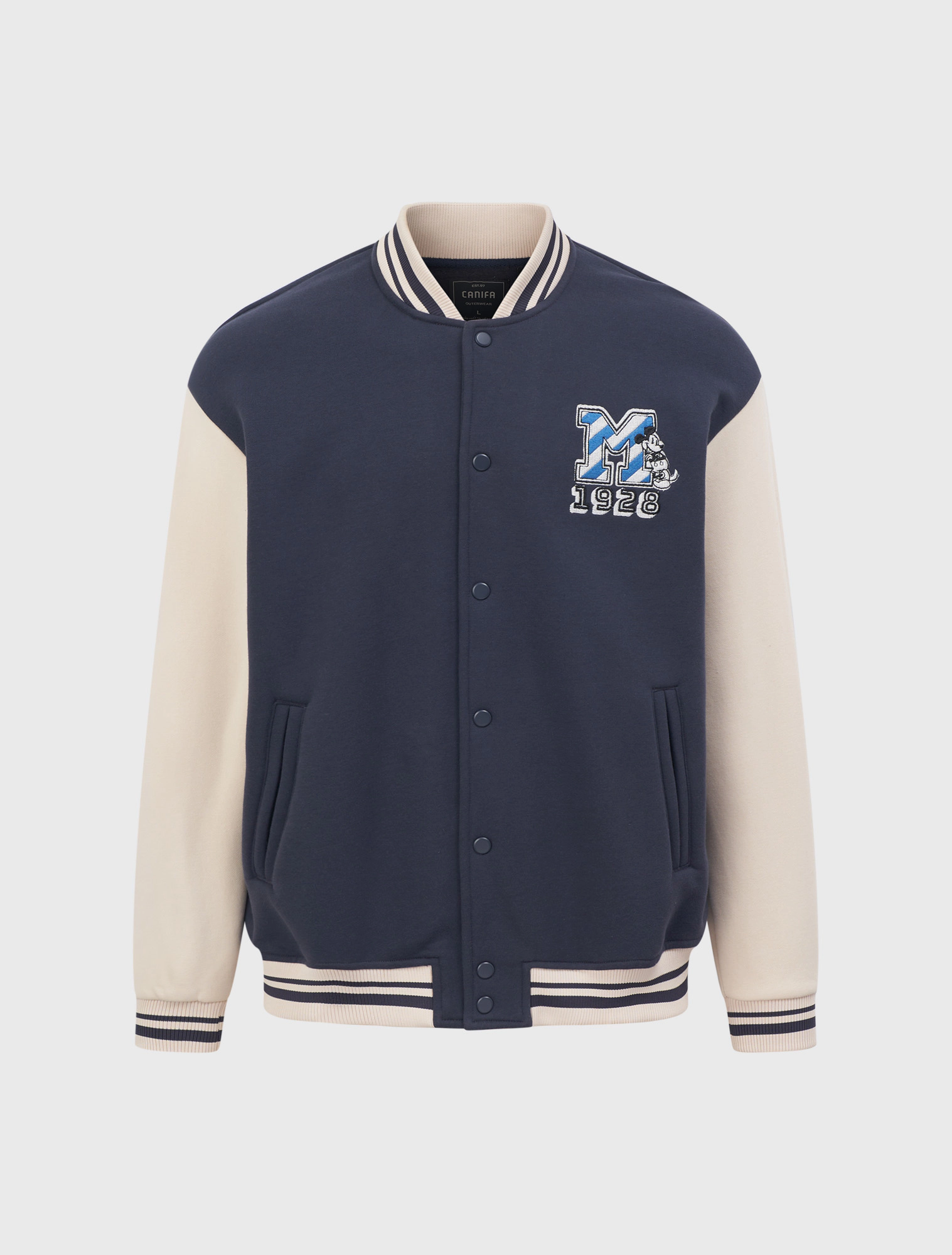 Áo khoác nỉ cào lông unisex người lớn. Dáng áo bomber hiện đại. Áo phối tay khác màu thân áo, bo rib kẻ thời trang.Màu sắc và hình in Mickey phù hợp cả nam và nữ. Chất liệu Cotton pha mềm mại, mặt trong cào bông dày dặn giữ ấm tốt.