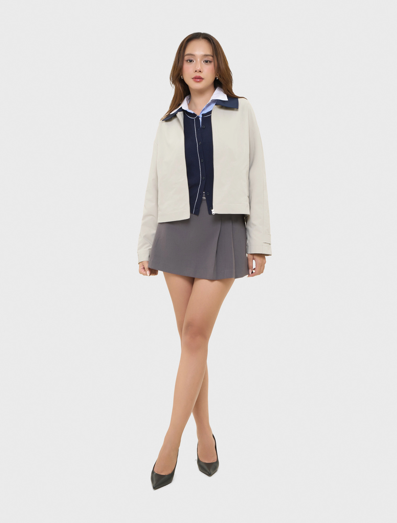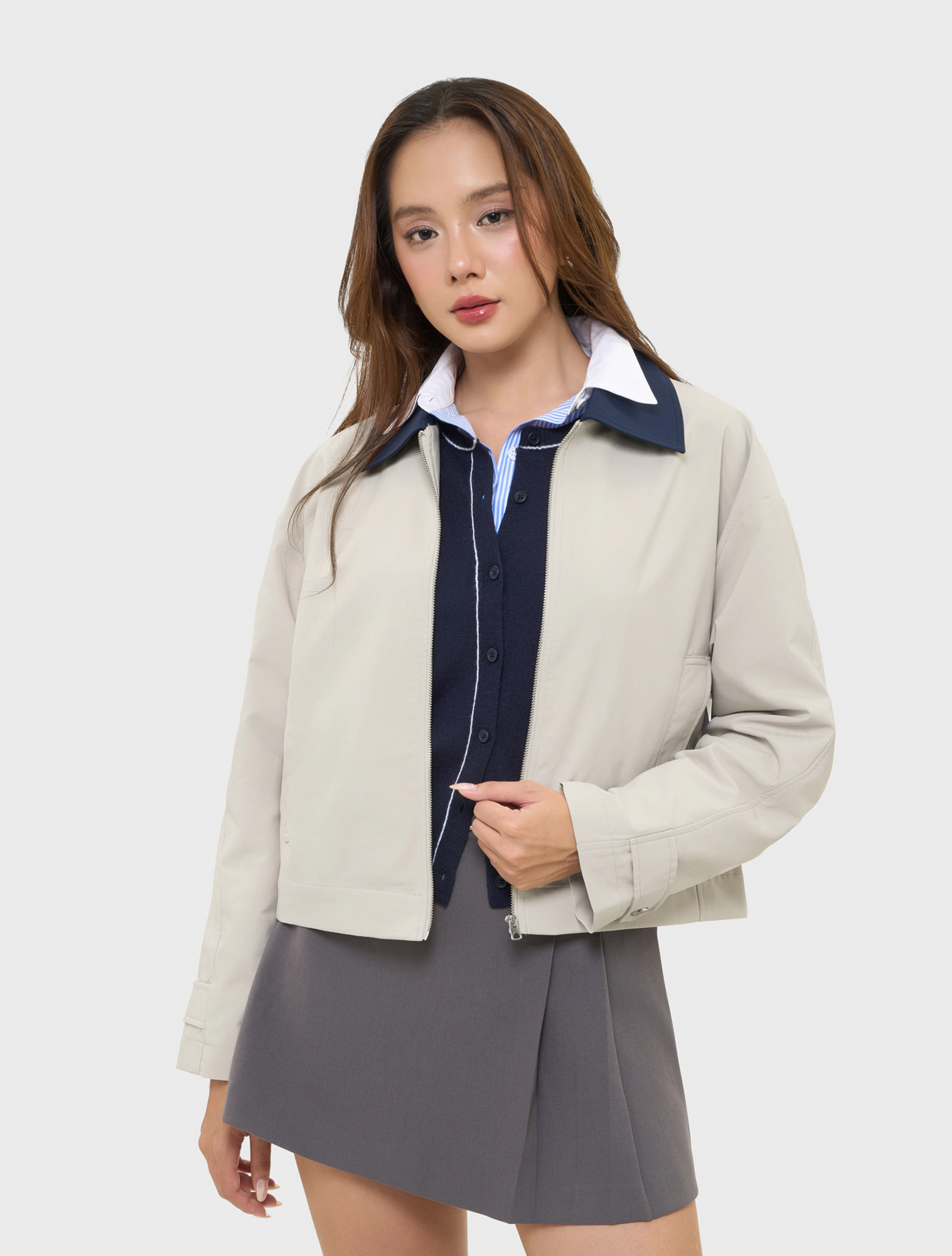 Áo khoác hai lớp dài tay, cổ bẻ, dáng suông. Chất liệu polyester thoải mái, phù hợp với thời tiết lạnh, mưa nhẹ.